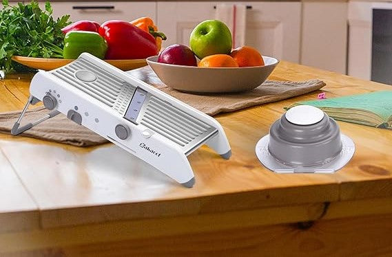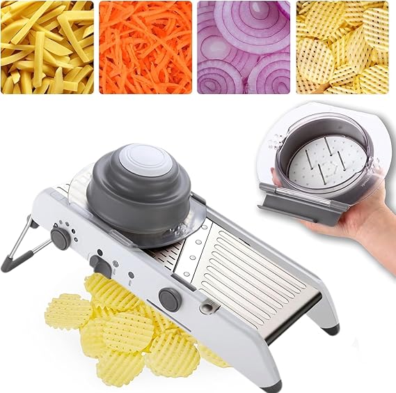 Save time in the kitchen with this mandoline slicer. It chops, slices, and grates vegetables quickly and safely.